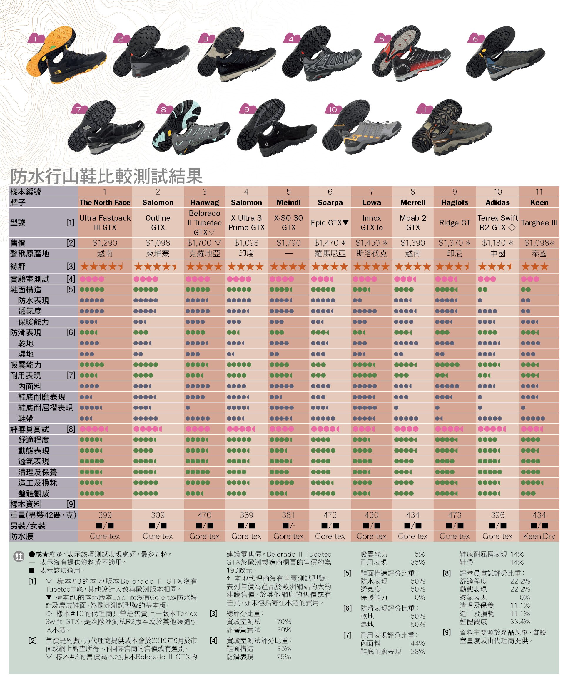 秋高气爽,最适合与亲朋戚友暂离烦嚣,一起到郊外远足,遥望远山翠绿,呼吸大自然的清新空气。本会与多个欧洲消费者组织合作,测试了11款防水行山鞋,发现3款样本的防水表现令人失望,另外,半数样本於湿滑地面的防滑表现未如理想,用家选购时不应只着眼款式,宜细心比较型号的实用性。样本的鞋面采用包括合成纤维或皮质的物料,均属低筒行山鞋,适合余暇行山或日常穿著,售价约由$1,098至$1,790。