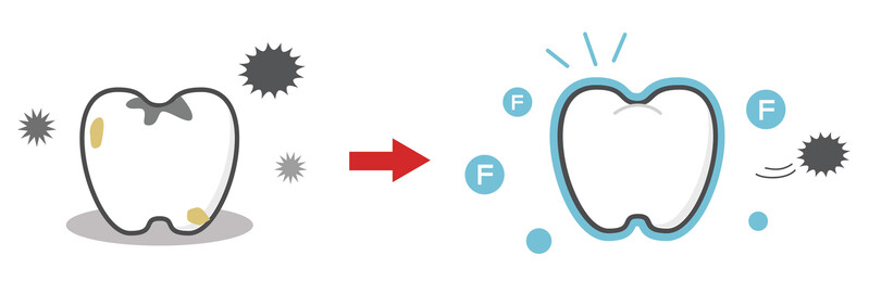 蛀牙初期,适量氟化物能加速唾液补充流失的矿物质。研究亦指出,适量氟化物有助修复早期受酸性物质破坏的蛀牙。另外,氟化物能巩固牙齿,加强其抵抗酸性物质侵害的能力,以及抑制牙菌膜滋长。