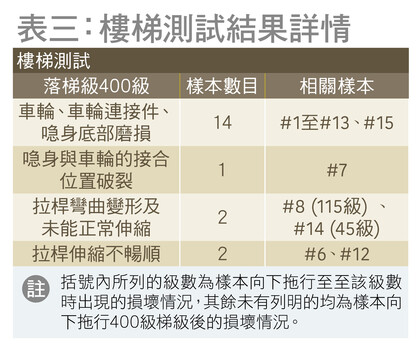 大部分样本于楼梯测试都表现不俗,拖行共400级梯级后,只有车轮、车轮连接件、喼身底部位置有轻微的磨损。「American Tourister」(#7)、「V-ROOX Studio」(#8)及「ELLE」(#14)则表现较逊色,#7的喼身与车轮的接合位置破裂,#8及#14分别经过115级及45级楼梯测试后,拉杆已弯曲变形,以致未能正常伸缩。详见表三。