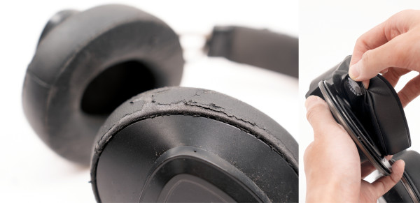 头戴式耳机的构造较坚固,寿命通常较其他类型耳机长,尤其是有线型号,由于当中没有配备内置电池或较复杂电路,更为耐用。随着时间过去,头戴式耳机套皮质表面可能有剥落或龟裂的情况,剥落的皮料可能于使用后黏附在皮肤或头发上,用户可能因避免出现尴尬而停止使用,即使耳机的音响效果理想,亦可能遭掉弃。现时不少头戴式耳机型号均可更换耳机套,用户可考虑于代理商、音响店或网上订购,并自行更换原厂或代用配件,有需要更可更换残破的头梁垫,令耳机焕然一新,延长使用期并减少浪费。视乎耳机设计,用户只需拆下已破损的旧耳机套,再套上(见图)或扣上新配件,个别型号更有多个颜色及材质的耳机套以供选择。