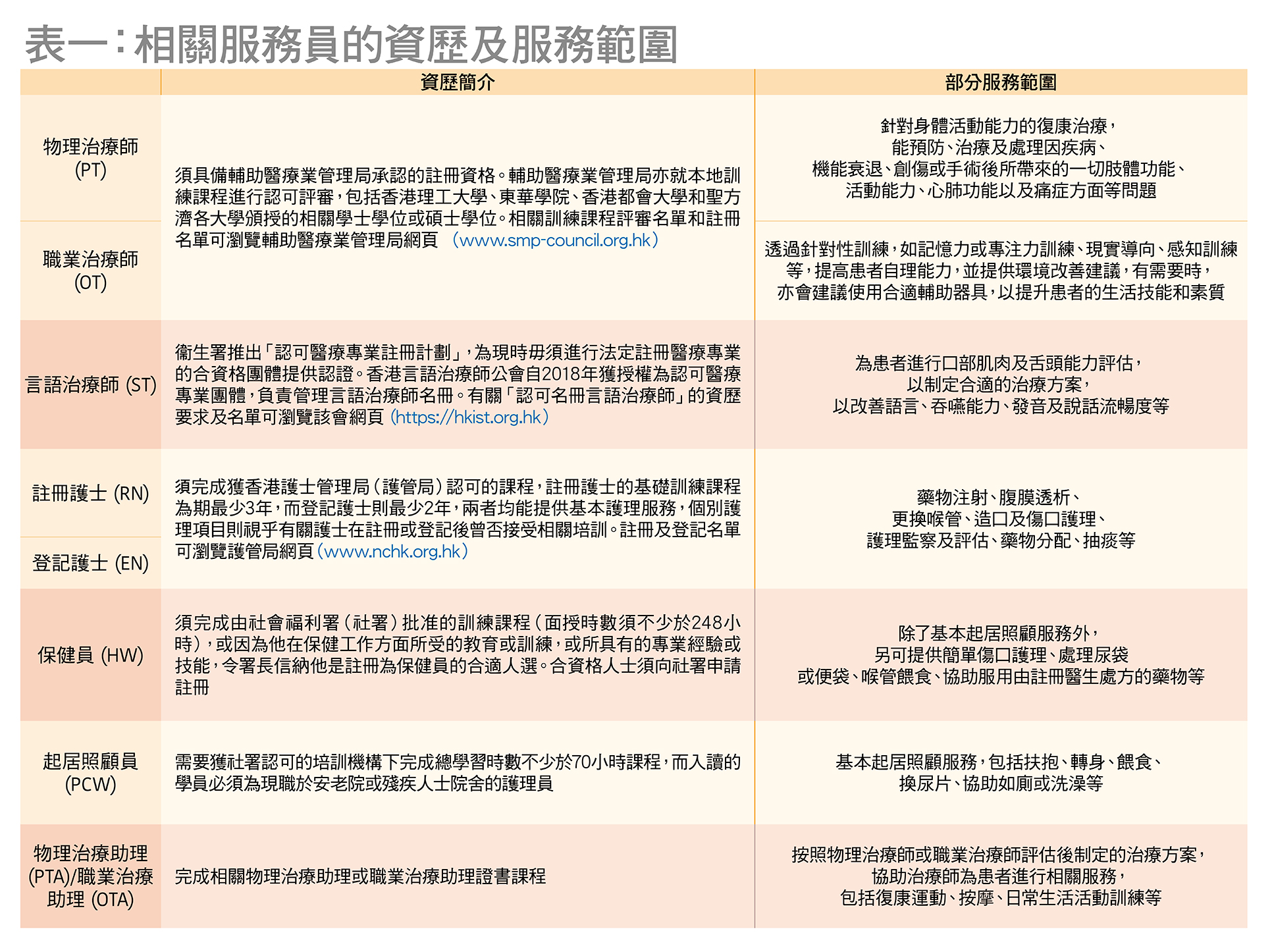 涵盖在调查的上门服务大致可分三类,包括由物理治疗师、职业治疗师或言语治疗师提供的专业复康治疗服务,由注册护士或登记护士提供的看护服务;以及由修毕保健员训练课程或起居照顾员等人士提供的个人照顾服务。由于不同专业资历或证书的服务员各有服务范畴,消费者必须先了解清楚,按实际需要选择合适的服务。