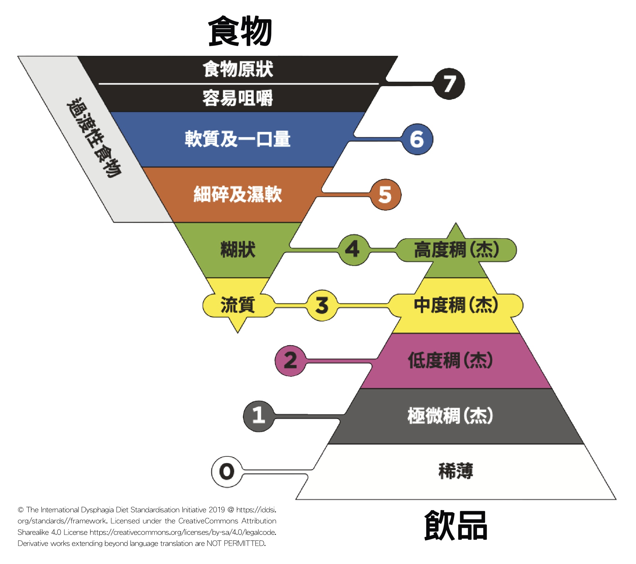 国际吞咽障碍饮食标准化委员会(International Dysphagia Diet Standardisation Committee) 于 2016 年订立,并于2017 年出版了一套适用于吞咽障碍患者的饮食框架。框架由八个连续等级(0-7)组成,每个等级均以数字、文字描述及颜色作为区别。框架呈现两个三角形:正三角形(尖端向上的)为饮品等级;倒三角形(尖端向下的)为食物等级。愈高等级,代表食物的大小、硬度、「杰」度愈高(或是饮料愈「杰」),吞咽困难患者需要有较高的咀嚼/吞咽能力才能处理。