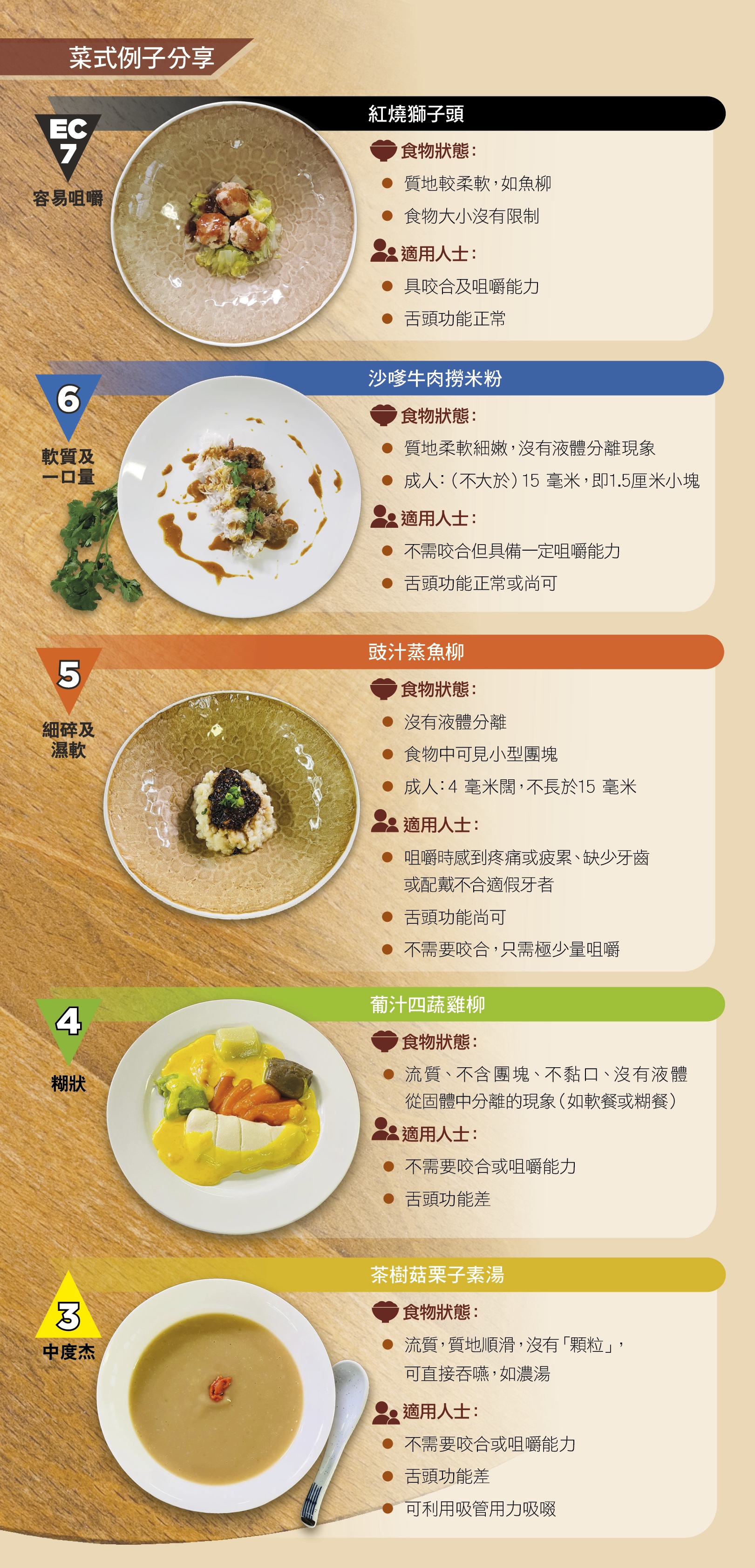 社联于 2023 年联同香港中文大学食品研究中心及香港大学吞咽研究所,参考「国际吞咽障碍饮食标准」(International Dysphagia Diet Standardisation Initiative, IDDSI),并结合科学数据及本地饮食文化,制定统一、清晰的《照护食标准指引》。这套标准不仅提供具体描述,更针对香港的日常餐饮(如粥粉面饭、点心等)提出合适的做法,让院舍、餐饮业及家庭都能依循,改善食物软硬度、营养及卖相,提升产品与服务质素。