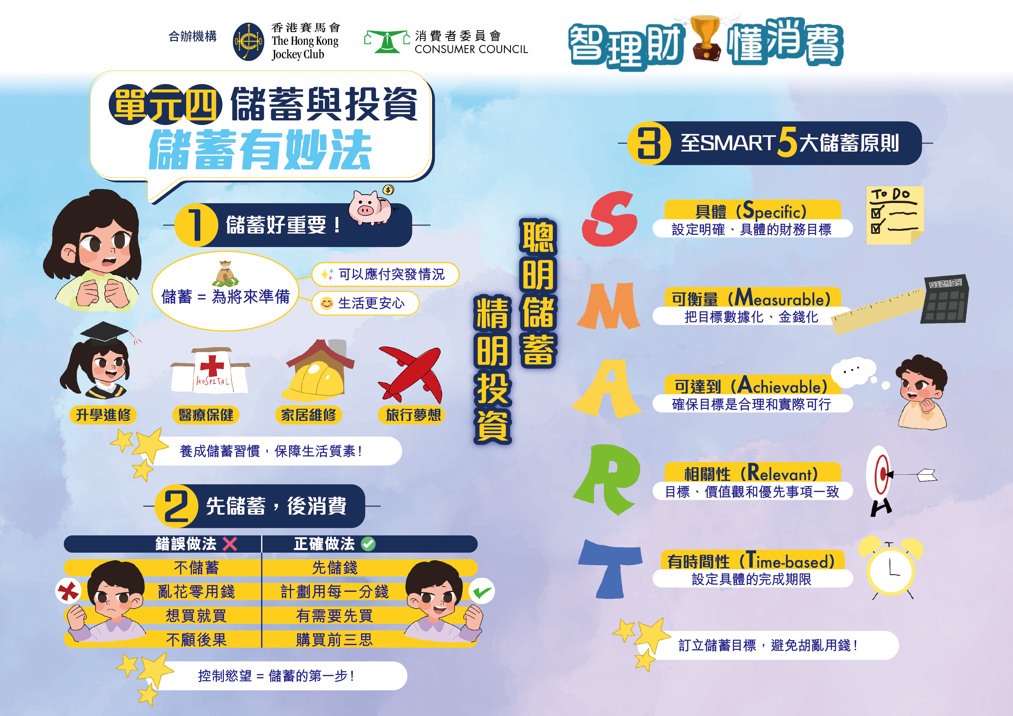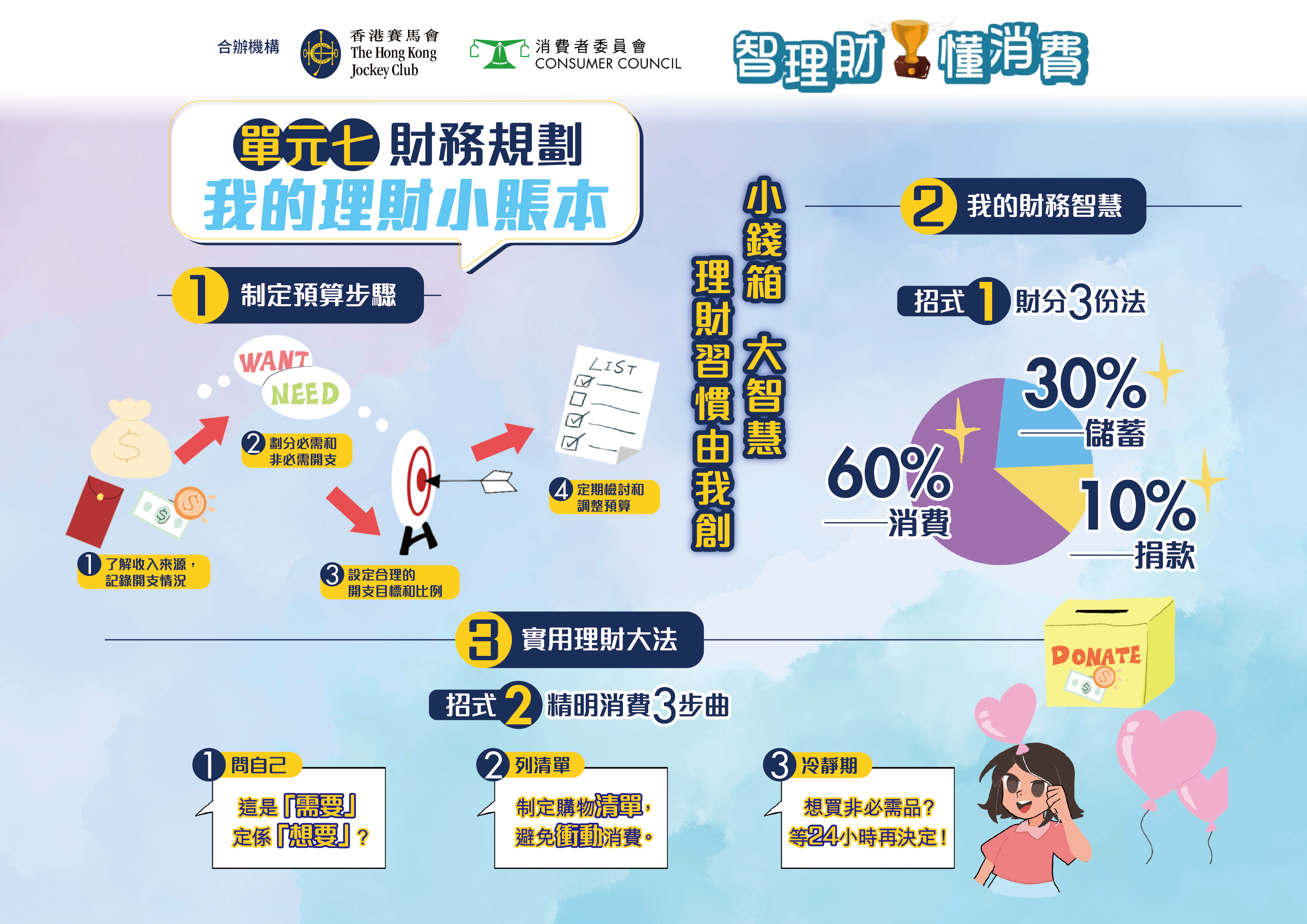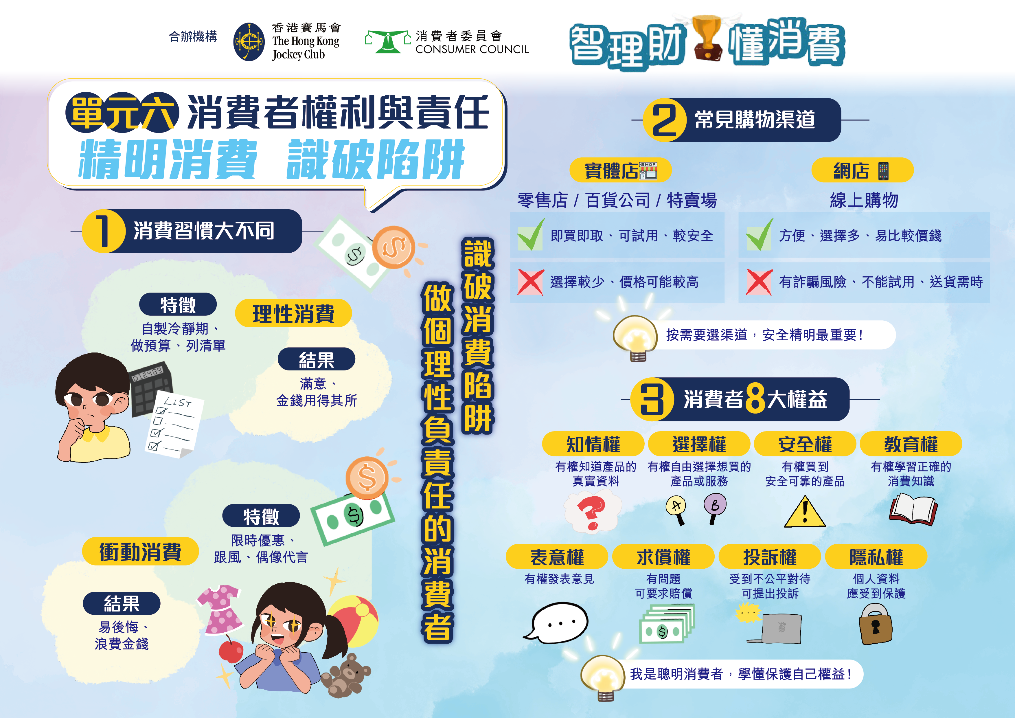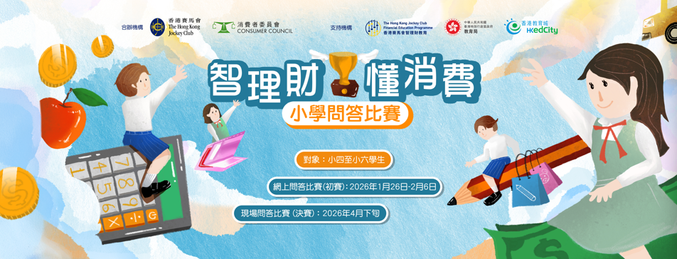 「智理财・懂消费」小学问答比赛 由消费者委员会(消委会)及香港赛马会合办,并获得教育局、「香港赛马会智理财教育」计划和香港教育城鼎力支持。比赛专为高小学生(小学四至六年级)而设,旨在向学生灌输正确的理财知识、价值观及态度,并养成负责任的理财与消费习惯。透过备战及参与比赛的过程,学生可加强在日常生活中灵活运用基础财务知识与技巧的能力,从而建立理性消费的观念。比赛题目将根据具公信力的《选择》月刊篇章及「香港赛马会智理财教育」计划的教材而设计,并辅以简单易明的信息图,帮助参加者掌握相关内容。