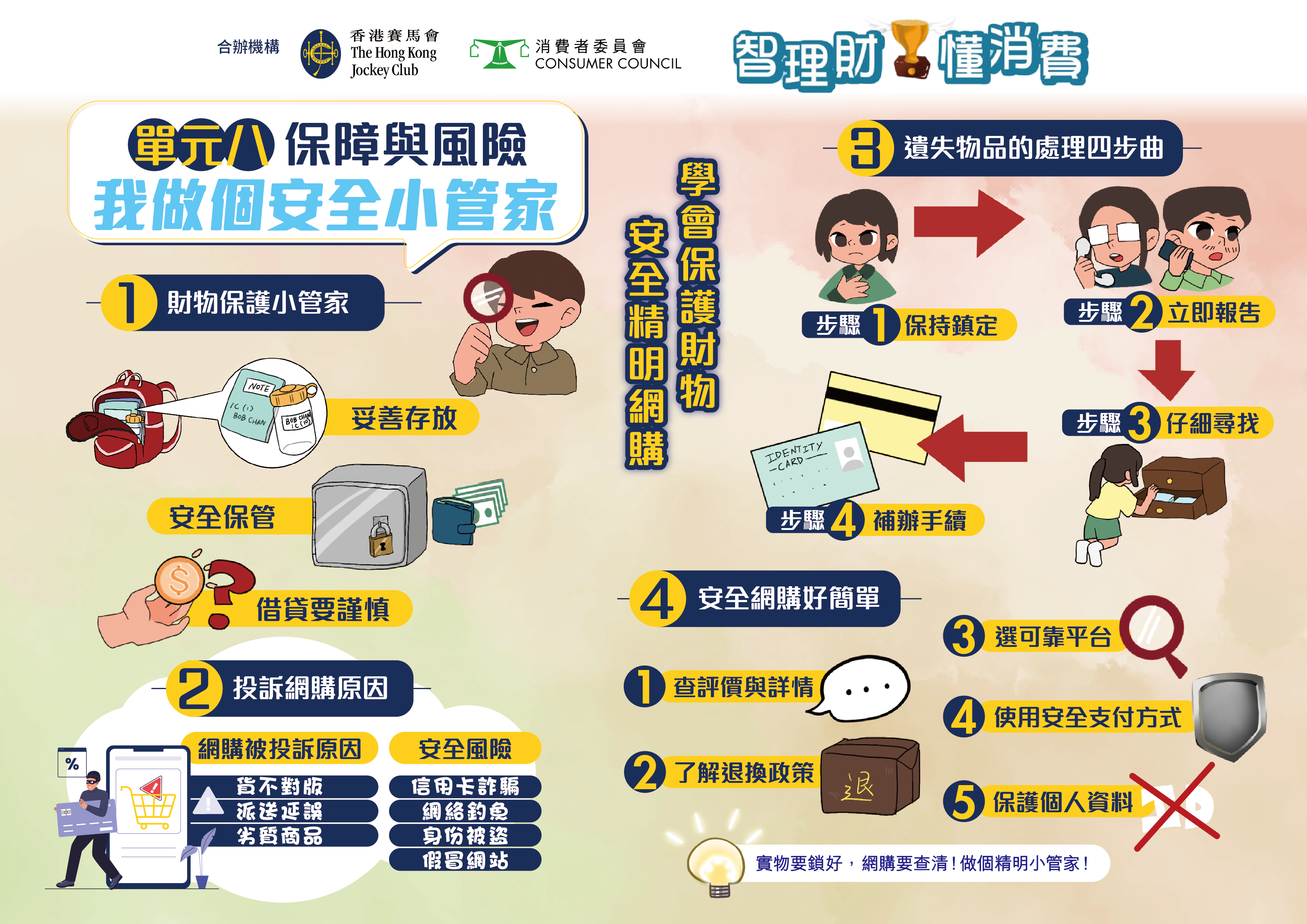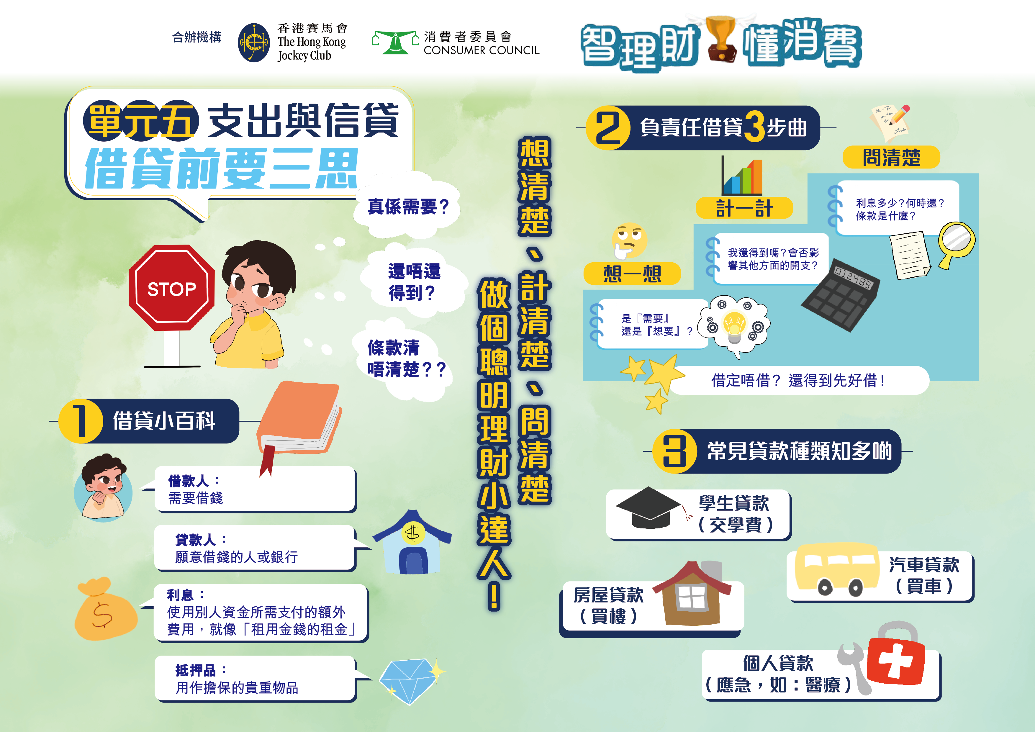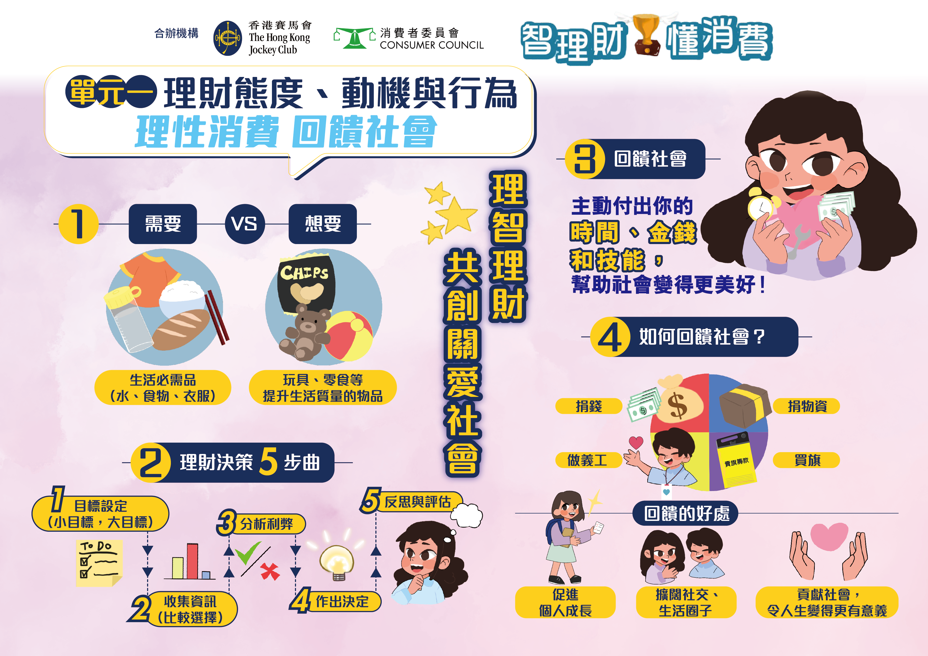 「智理财・懂消费」小学问答比赛 由消费者委员会(消委会)及香港赛马会合办,并获得教育局、「香港赛马会智理财教育」计划和香港教育城鼎力支持。比赛专为高小学生(小学四至六年级)而设,旨在向学生灌输正确的理财知识、价值观及态度,并养成负责任的理财与消费习惯。透过备战及参与比赛的过程,学生可加强在日常生活中灵活运用基础财务知识与技巧的能力,从而建立理性消费的观念。比赛题目将根据具公信力的《选择》月刊篇章及「香港赛马会智理财教育」计划的教材而设计,并辅以简单易明的信息图,帮助参加者掌握相关内容。