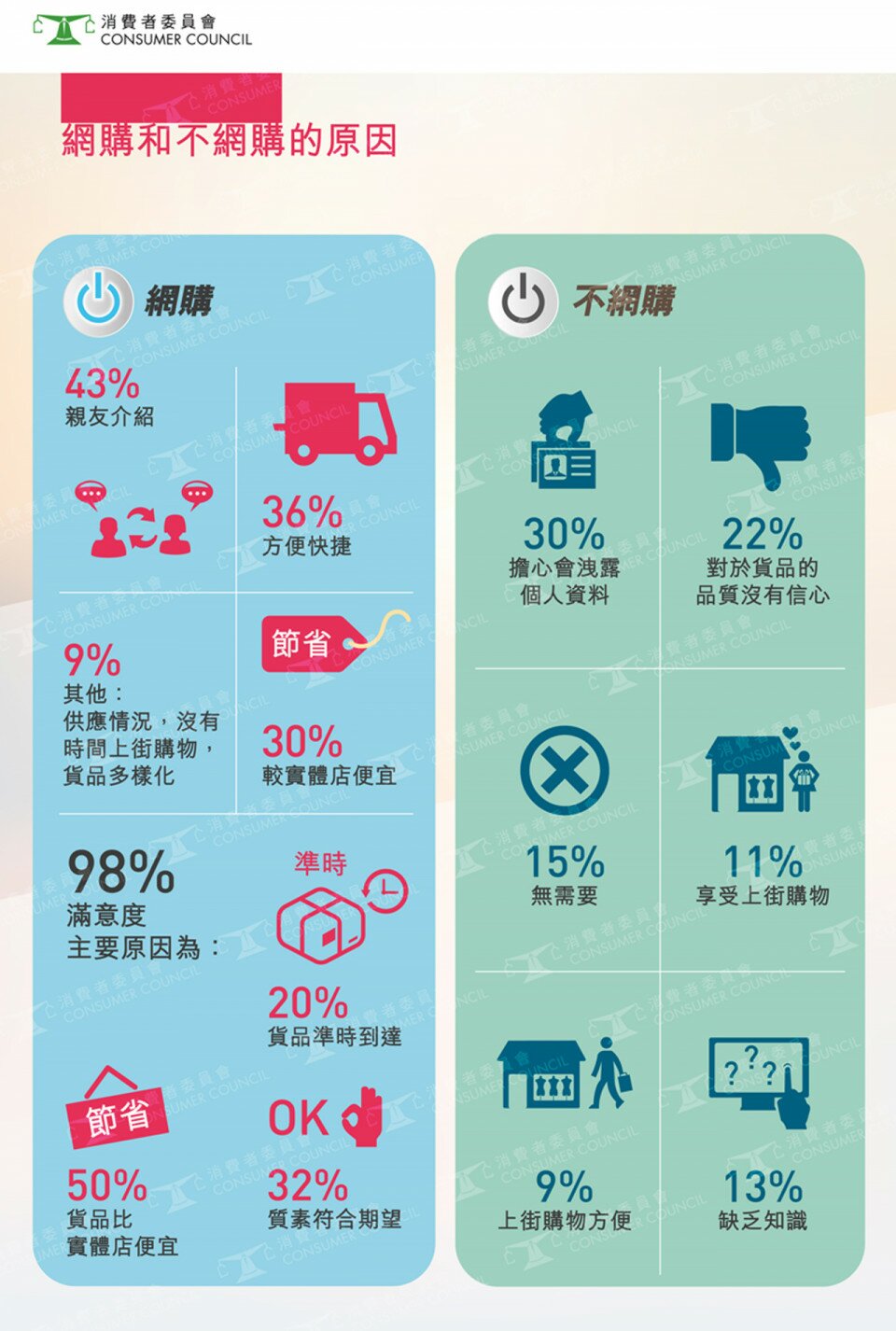消费者网购的原因为:亲友介绍(43%)、方便快捷(36%)、较实体店便宜(30%)。他们对网购的满意程度亦非常高,98%表示满意或非常满意。消费者普遍满意网上购物的原因有:货品价钱较实体店便宜(50%)、质素符合期望(32%)以及货品准时到达(20%)。对于网购带来的方便和用家友善浏览的网站他们亦非常满意。