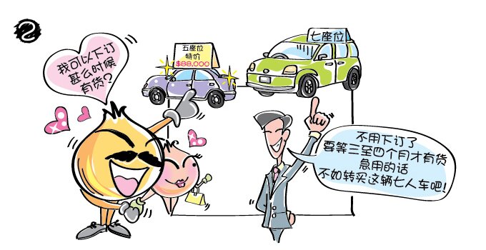 洋葱爸爸问:「我可以下订,什么时候有货?」车行职员拒绝:「不用下订了,要等三至四个月才有货,急用的话,不如转买这辆七人车吧!」