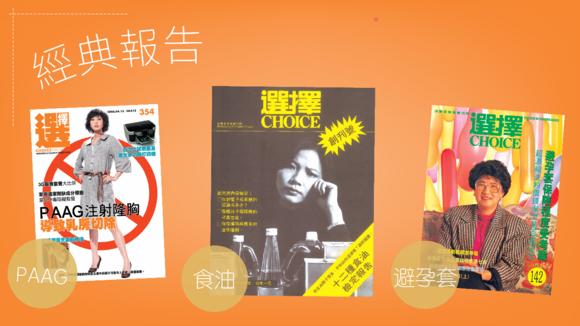 创刊号、销量,这些固然是可称之为经典报告,但有些报告带来的并不只是销量数字,对于市民生活的健康、民生议题都有重要影响,这些亦是《选择》的经典报告。 2006年第354期的《选择》报导了有关注射PAAG(聚丙烯酰胺凝胶)隆胸所引致的后遗症,并对妇女警告此物料的严重性。由于议题关于市民切身的健康问题,报告刊登后引起十分大的回响。传媒广泛报道,美容业界及政府亦有作出回应,内地政府机关亦自此禁止注射PAAG。此报告带来的影响遍及全港及内地,亦为维护了消费者的健康及提供保障。