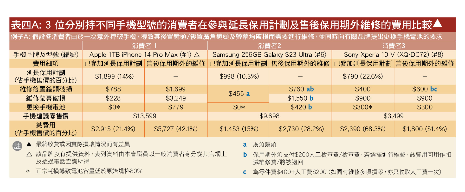 从表四A可见,在参与了延长保用计划(「计划」)下,消费者1须支付的总费用为$2,915,而消费者2须支付的总费用为$1,453,两者均较保用期外维修所需的费用低。然而,消费者3在相若的情况下,参与计划的总维修费用却较保用期外高。虽然消费者3的手机〔「索尼」(#8)〕及其计划的价钱均为3个型号之中最低,然而,若同时考虑计划收费占机价的百分比,可见#8的比例为3个型号之中最高(占机价的22.6%)。故此,消费者在决定是否付费参与延长保用计划时,不宜单靠其价格的高低来作唯一指标,应同时考虑其占手机售价的比例。除了计划的价钱及其占机价的百分比外,消费者亦不容忽略计划的保障范围,包括可获免费维修的项目及条件、付费维修所牵涉的其他额外费用,例如检查费及人工费等,以更全面地衡量保用计划是否划算;切勿以为付费参与了延长保用计划,便等同可在计划有效期内免费维修所有损坏及故障。以上述情况为例,即使在计划有效期内,3个品牌均会就维修破损的镜头及萤幕另外收费。