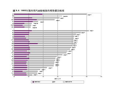 - 對商品例如石油產品徵收的稅項,有很多政策上的考慮,稅項一則可以為政府提供收入,以支持行政和發展計劃的開支,二則有助把一般稅項維持於低的水平。不過無可否認,汽車用燃油的稅項佔零售價的比重相當大。高的稅率和徵收形式(以每公升或百分率計算)均對其營銷有影響 (2.9 和2.10段)。比方說,燃油稅高,減價與整體零售價格相比佔相當小的部份,可能抑制了零售商以減價來吸引顧客的意念。