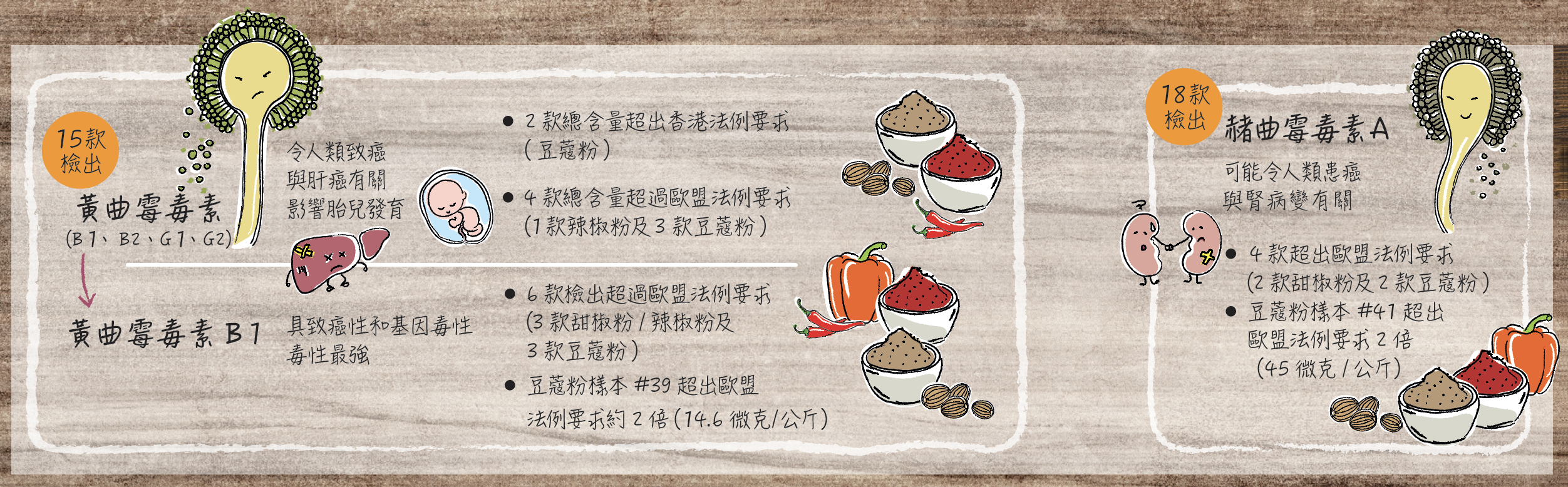 6款樣本檢出的黃曲霉毒素B1含量超過歐盟法例要求,辣椒屬香料及肉豆蔻各倍一半,分別是「Hansaeng」袋裝紅辣椒粉(#10,7.7微克/公斤)、「香料獵人」有機甜紅椒100%(#11,8.4微克/公斤)、「McCormick Gourmet」有機咖仁辣紅粉(#13,13.5微克/公斤)、「香料島」豆寇粉(#16,11.4微克/公斤)、「味好美」豆寇粉(#17,12.4微克/公斤)及「源興香料公司」豆蒄粉(#39,14.6微克/公斤)。