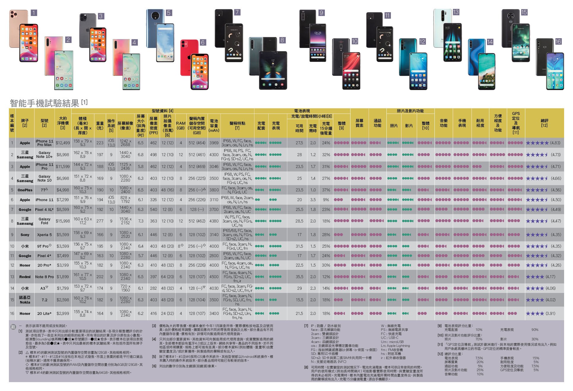 測試涵蓋16款智能手機,當中1款為屏幕可摺疊式的型號,售價由$1,799至$15,998。測試項目包括電池表現、屏幕質素、手機表現、耐用程度、照片及影片功能、GPS 定位及導航等。測試發現,2款售價過萬的型號於耐跌撞測試後出現損壞,耐跌撞能力欠佳,1款型號充電需時3.5小時但可用時間卻不足1日。