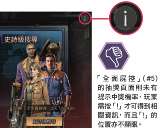 「抽獎、扭蛋、抽寶箱」作為免費手機遊戲出售商品的常見手法,中獎機率及獎品詳情的透明度會有助於玩家作出課金抽獎決定。然而,調查發現僅7款遊戲向玩家披露抽獎池內各類商品的獲得機率,當中5款遊戲(#1、#2、#6、#9及#11)抽到最稀有商品的機率低於1%,由0.2%至0.8%,而#4及#3中獎機率最低分別為3%及6.7%。由於中獎機率低,玩家或需要大量課金才有機會取得滿意的商品或資源,以獲得完整的遊戲體驗。調查另發現7款遊戲(#1、#3至#6、#8及#11)未有於抽獎頁面的顯眼位置明確提示該服務只屬有機會中獎,當中#5及#8同時未有公布中獎機率,資訊透明度不足。另一方面,7款遊戲(#1、#2、#6、#8至#11)未有於抽獎頁面披露獎品的效果、用途或其他獲取途徑等資訊讓玩家參考以作出抽獎決定,透明度有待改善。