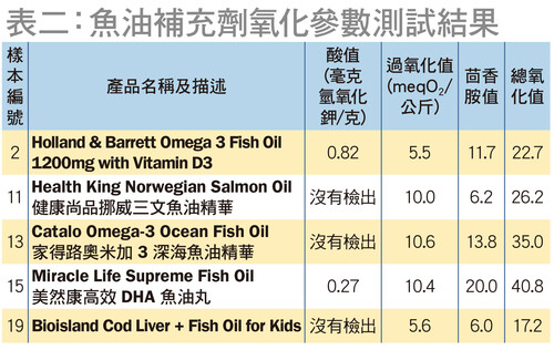 有5款沒有顯示任何調味劑或香料並在最少其中一個氧化參數測試的結果高於食品法典委員會魚油標準329-2017的上限,包括#2、#11、#13、#15及#19。在這5款樣本當中,PV測試結果範圍由每公斤5.5meqO2至10.6meqO2,全部都高於標準上限每公斤5.0meqO2;AV測試結果範圍由6.0至20.0,全部均沒有超出標準上限;totox測試結果範圍由17.2至40.8,#11、#13及#15超出標準上限26。