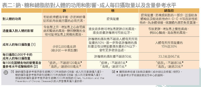 鈉有助維持體內細胞外液和酸鹼的平衡,亦是神經傳送和肌肉收縮方面的必需元素。惟長期過量攝取鈉可導致血壓上升,增加患上心血管疾病和腎病的風險。衞生署衞生防護中心指,進食過多鹽可能會損害胃黏膜,增加致癌物幽門螺旋菌寄生的機會,增加患胃癌的風險。世界衞生組織(世衞)亦認為,鹽和鹽醃的食物可能增加患上胃癌的風險。世衞建議成人每日應攝取少於2,000毫克鈉,即約等於5克食鹽(略少於1平茶匙)所含的鈉。根據食物安全中心(食安中心)為消費者提供的參考水平,每100克固體食物含超過600毫克鈉即屬高鈉食品。