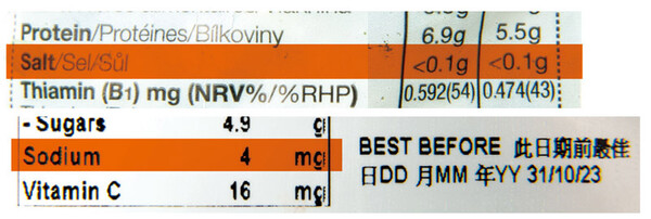 檢測結果發現「Jumbo max」(#9)的鈉含量測試結果(每100克7.22毫克鈉)高於營養標籤標示值(每100克3.7毫克鈉)95%。另「M&S」British Garden Peas(#24)的營養標籤以鹽含量及「<」標示數值,而「M&S」Supersweet Sweetcorn(#10)則以鹽含量標示,相關營養標籤應以鈉含量及實際數值標示。相關的樣本資料已經轉交食物安全中心(食安中心)跟進。營養標籤的資料錯誤有機會誤導消費者選購不合適的產品,特別是患有長期病患例如高血壓的人士,本會促請生產商及代理商正視及改善問題。