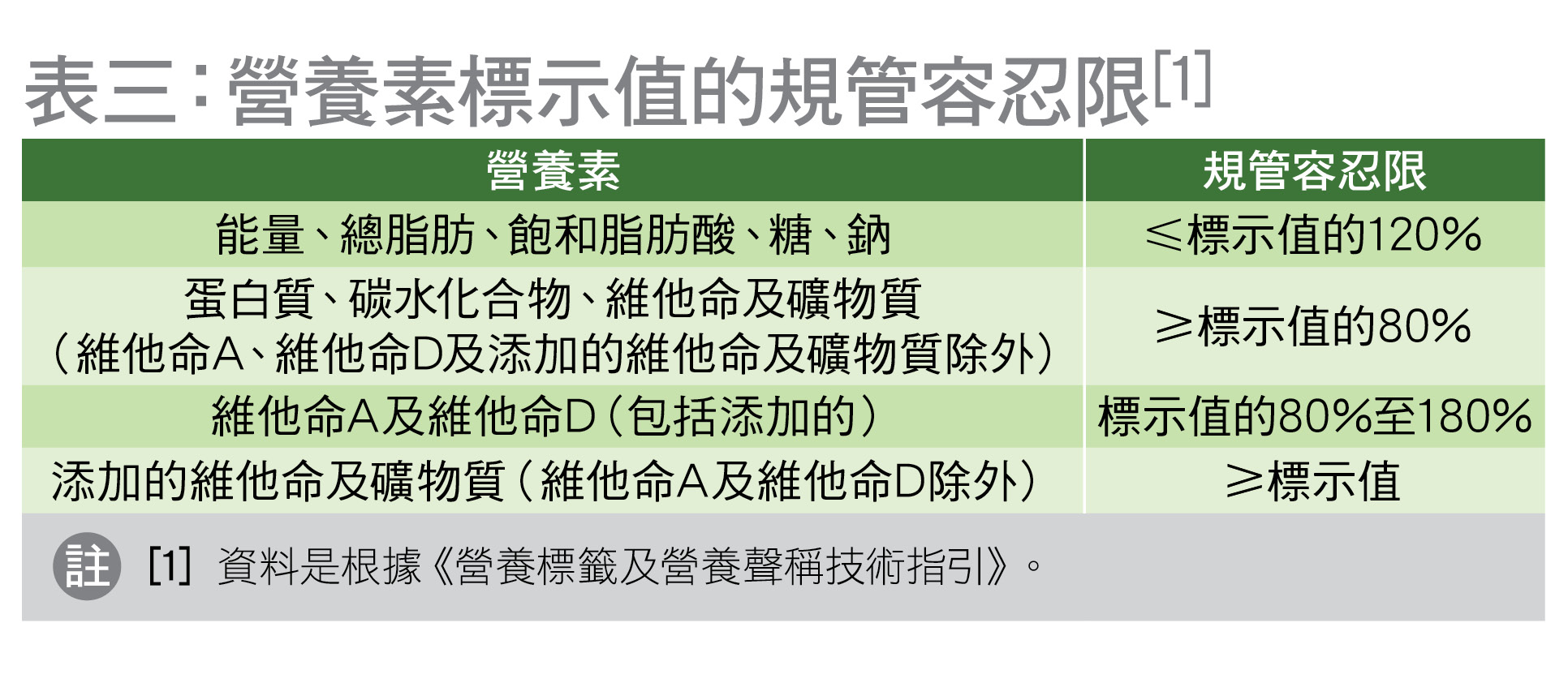 《規例》規定除所列獲豁免遵從規定的項目外,預先包裝食物的營養標籤必須標示能量和7種核心營養素,包括反式脂肪酸和鈉的資料,並應以絕對值標示。《營養標籤及營養聲稱技術指引》(下稱《技術指引》)亦為能量和營養素標示值與實際檢出量的差距訂定了規管容忍限,以及對能量和部分營養素訂定了標示為「0」的定義。