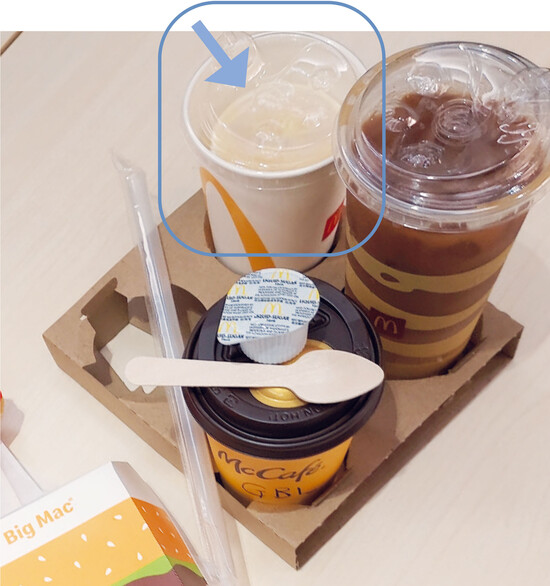 圖13:有1次於「麥麥送」點選1個套餐加單點食物及飲品,食物送達時其中1杯飲品用了2個紙杯盛載。