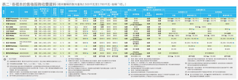 各供應商提供的資料(見表二)顯示,各測試型號的新機全機保用期由2年至4年不等,其中「開利Carrier」(#9)提供4年最長的全機保用期,而「大松TOSOT」(#6)、「約克YORK」(#12)及「LG」(#14)則只提供2年較短的全機保用期。壓縮機是冷氣機內較耐用的部件,保用期普遍為5年,而「LG」(#14)及「格力GREE」(#4)更分別提供10年及永久保用期。