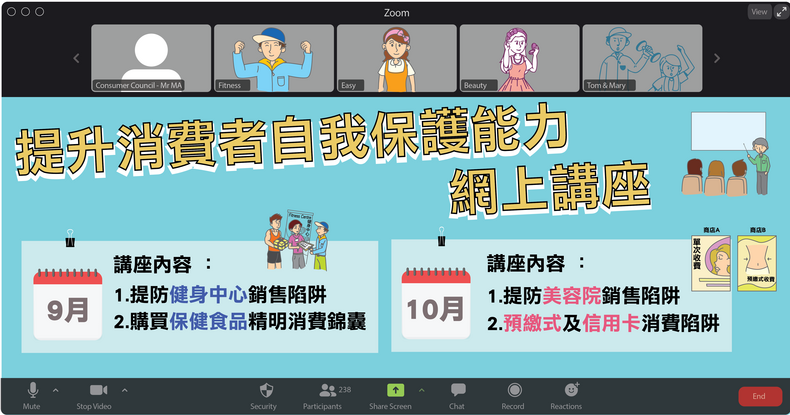 「提升消費者自我保護能力」工作坊透過「體驗式」活動環節,包括觀看個案重演短片、進行反思活動、角色扮演及遊戲,讓參加者循序漸進地認識部分健身中心及美容院的不良銷售手法,並協助他們擊退有關銷售陷阱,養成正確消費態度。