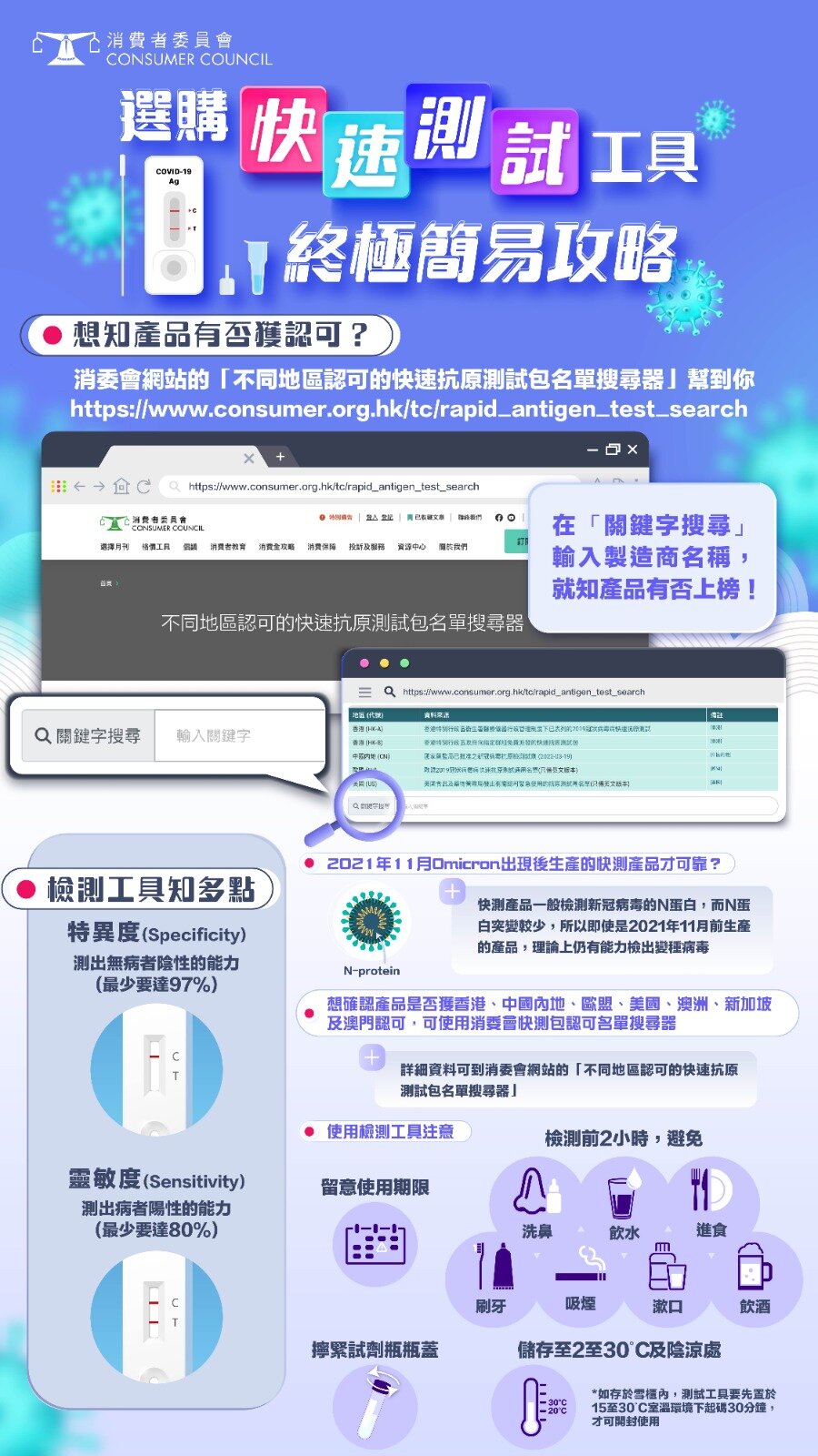 學校陸續恢復面授課堂,做快速測試成每日的指定動作。快速抗原測試包選擇多多,你知道如何選購受認可的快測包?進行快測前又有什麼注意事項?即看消委會資訊圖了解!