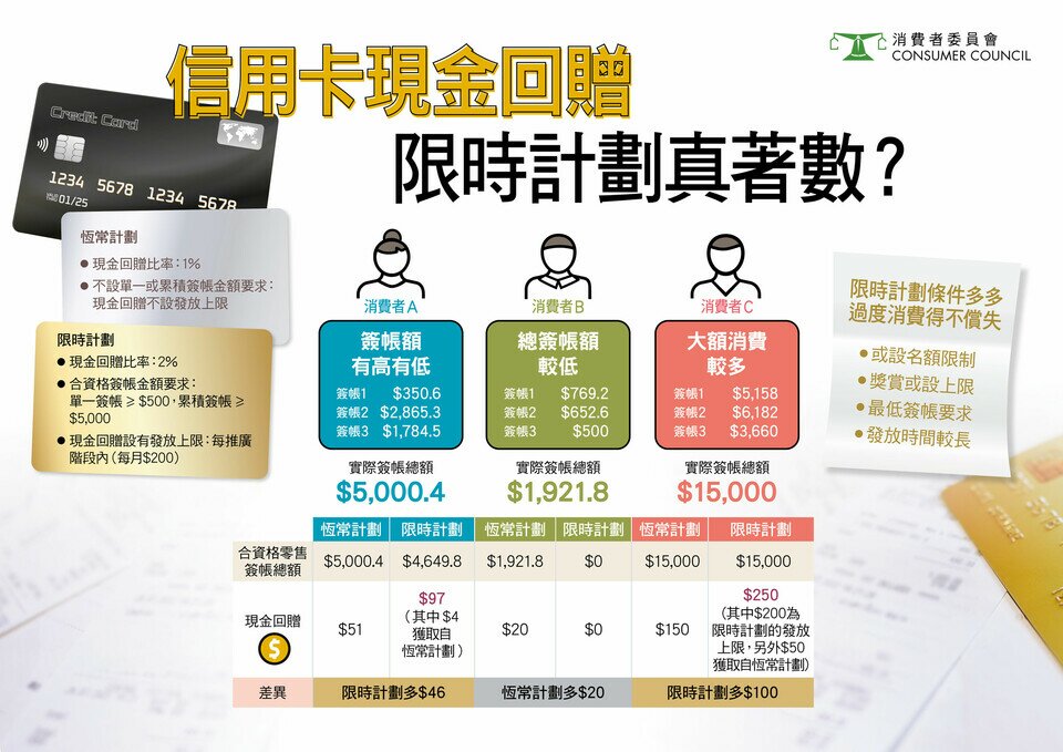 例如三位不同消費習慣的消費者,限時計劃看似可領取多啲回贈,實情有唔少符帶條件,係咪真著數?精明的你,除了要識揀、識計,還要記得不要為優惠而過度消費啊~