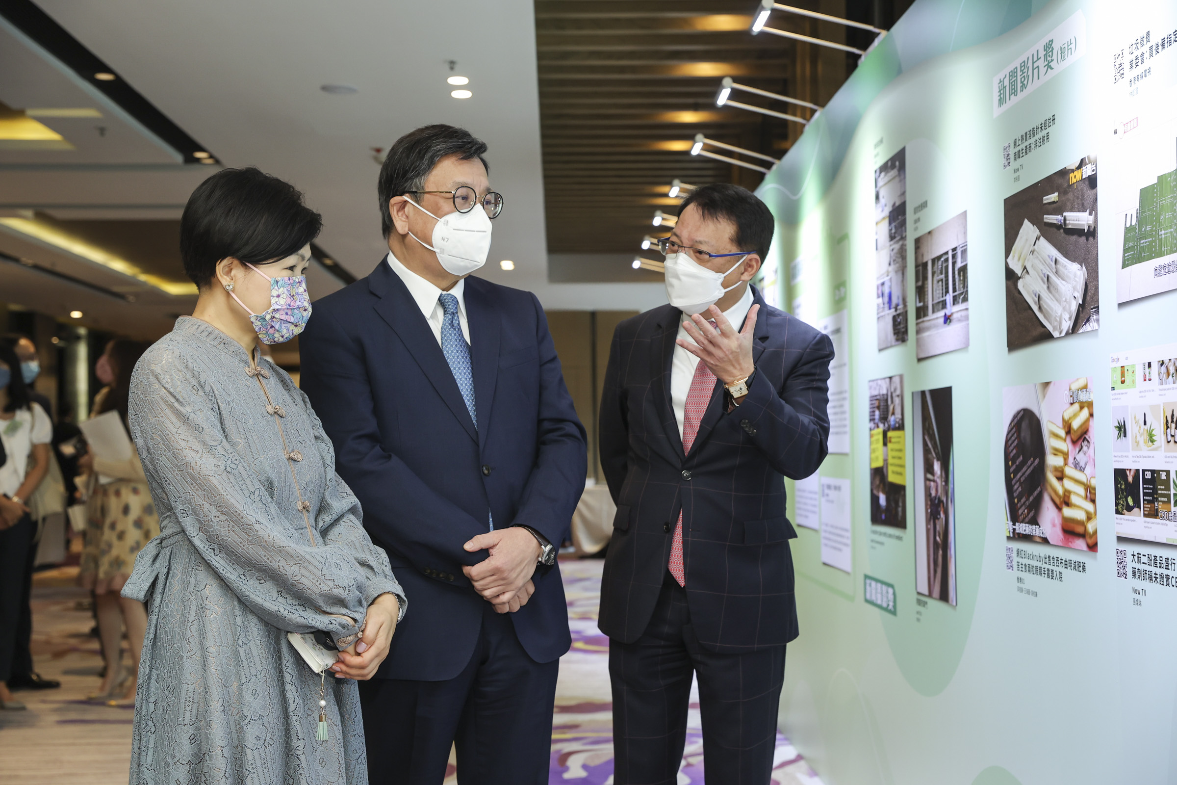 - 主禮嘉賓商務及經濟發展局局長丘應樺先生欣賞得獎作品展板,由消費者委員會主席陳錦榮先生及消費者委員會總幹事黃鳳嫺女士陪同。