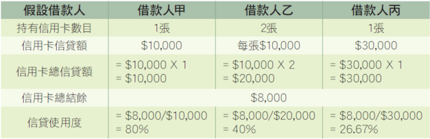 如何計算一個人的信貸使用度,就是其所擁有的信用卡總結餘(亦即需要清還的卡數),除以其所有信用卡的總信貸額(碌卡上限金額)。