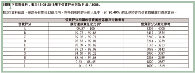 綜合以上資料所得出的評分,評分共分為A至J級10個級別,A為最好,J為最差。信貸評分愈高,代表借款人信貸相對穩健,能夠準時還款、出現壞帳的風險較低。此評分會每天更新。